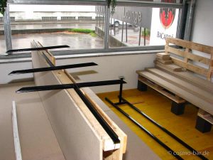 Nun bauen wir die ganzen Einzelteile zusammen und verschrauben die Sitzflächen und Rückenlehnen der Loungen, nachdem wir sie mit Winkeln am Boden fixiert haben.